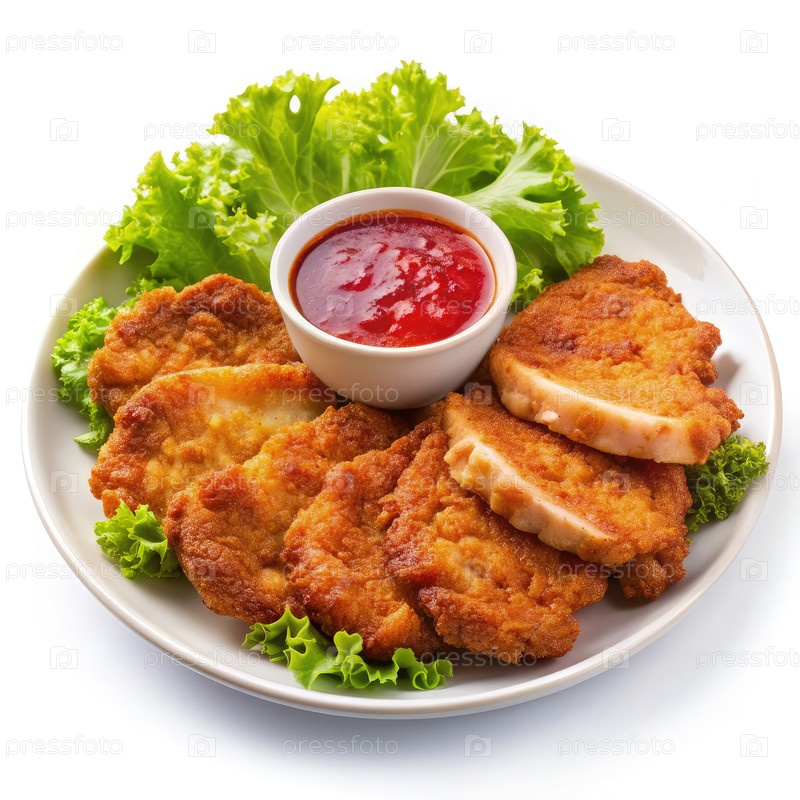 Жареные котлеты из свинины подаются с соусом и свежим салатами на тарелке