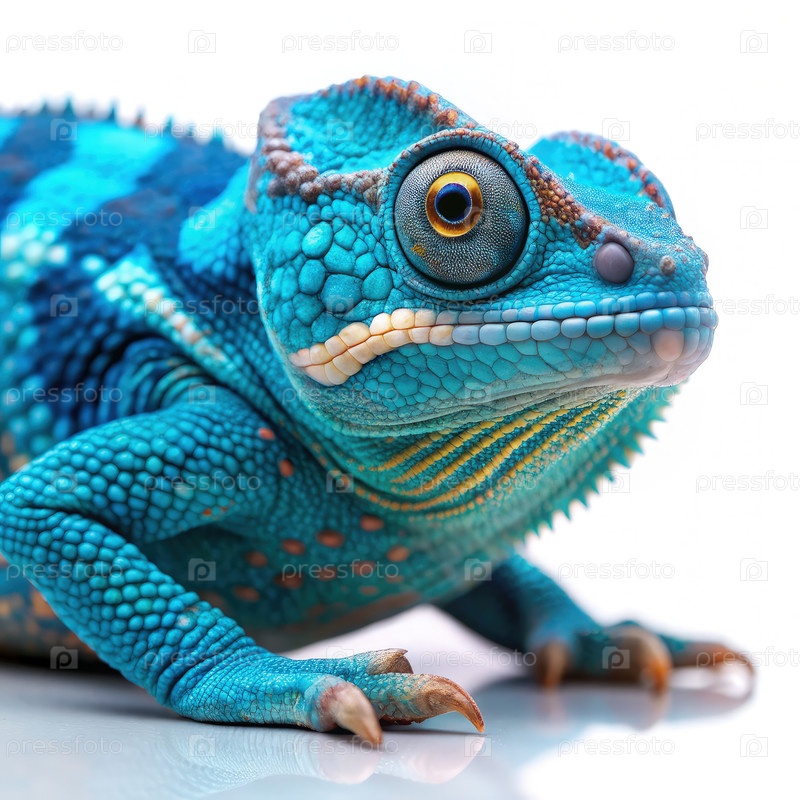 Впечатляющий голубой пантера хамелеон привлекает внимание своими яркими цветами и сложными узорами на чистом белом фоне