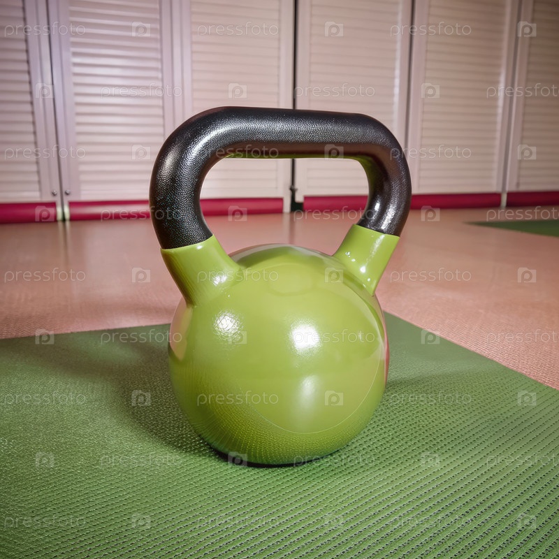 Зеленый кеттлбелл помещается на коврик в крытом тренажерном зале во время тренировки, посвященной силовой подготовке
