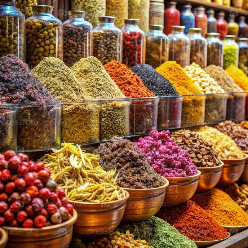 Живой традиционный турецкий травяной аптекарь, демонстрирующий множество специй и трав, расположенных в мисках и банках в дневное время