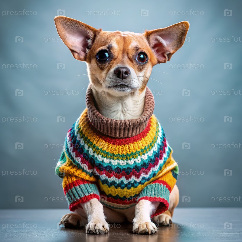 Маленькая собака в красочном свитере позирует на поверхности на мягком фоне, демонстрируя свою очаровательную личность