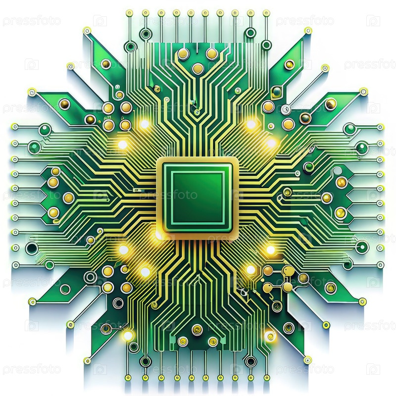 Абстрактный элемент платы с сложным дизайном на белом фоне, демонстрирующий технологические мотивы и электрические соединения