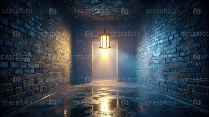 Слабо освещенный коридор со светящимся фонарем, раскрывающим дверь в темной атмосферной среде