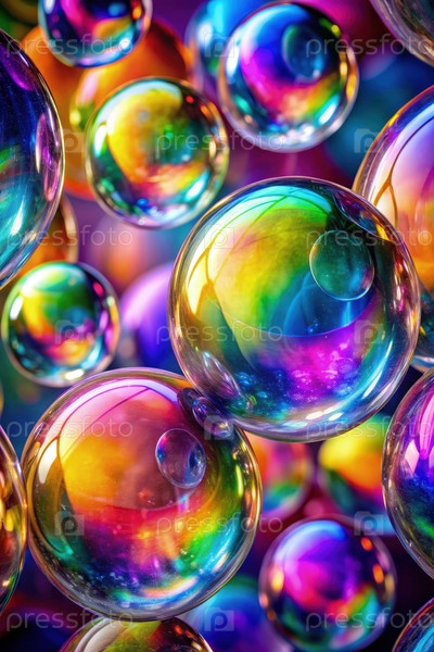 Красочные радужные стеклянные пузырьки захвачены на ярком дисплее, демонстрирующем их отражающие поверхности и различных размеров