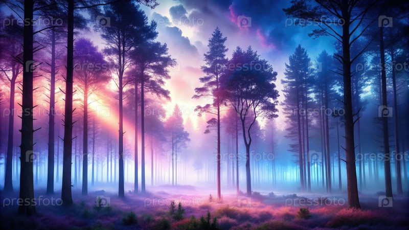 Завораживающий туман обволакивает мистический лес на рассвете, раскрывая силуэты высоких деревьев среди эфирного света и ярких цветов