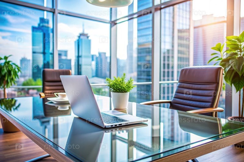 Офисная обстановка с полированным рабочим столом, ноутбуком и живописным видом на горизонт города в дневное время