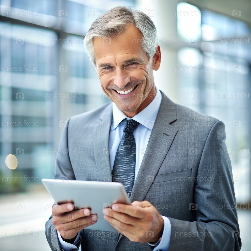 Счастливый профессионал средних лет, использующий планшет в офисном здании