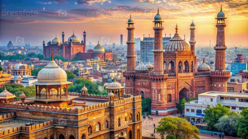 Вид на закат современной архитектуры вокруг исторической мечети в оживленном городском пейзаже
