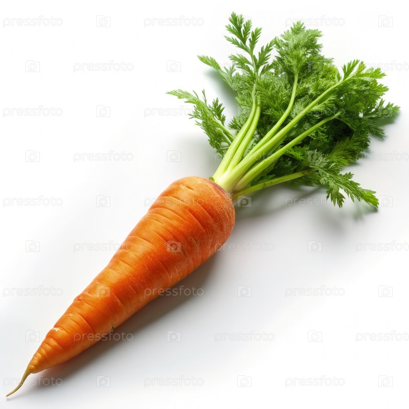 Свежесобранная морковь, отдыхающая на чистой белой поверхности с ярко-зелеными листьями, отображаемыми в яркой освещенной обстановке
