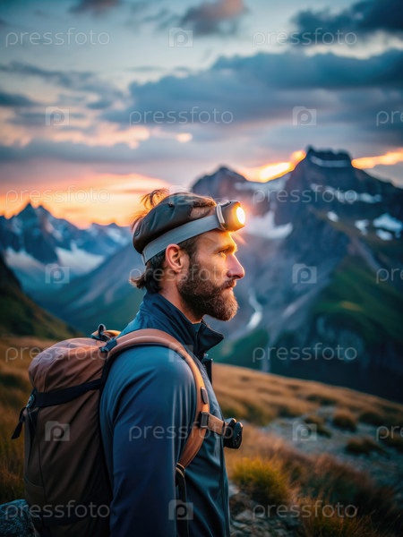 Путешественник, носящий фары, устанавливает живописную горную вершину на закате. генеративный ИИ