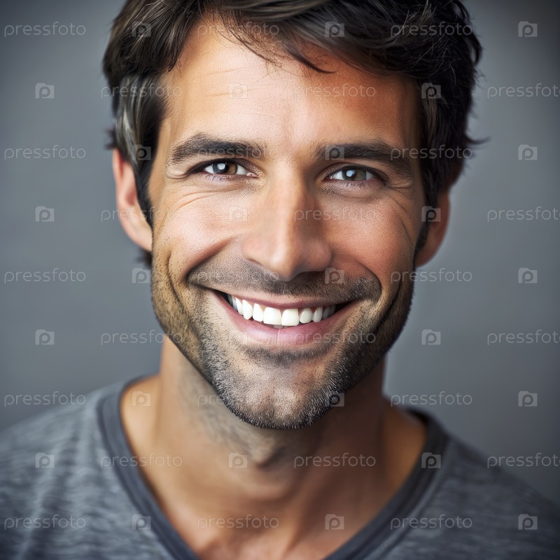 Радостная улыбка мужчины в непринужденной одежде на нейтральном фоне