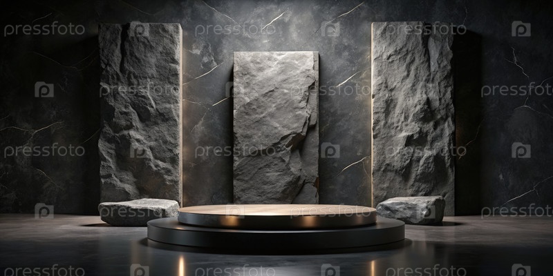 Элегантный черный подиум, установленный на фоне сырой скалы для демонстрации продуктов в современном дисплейном пространстве