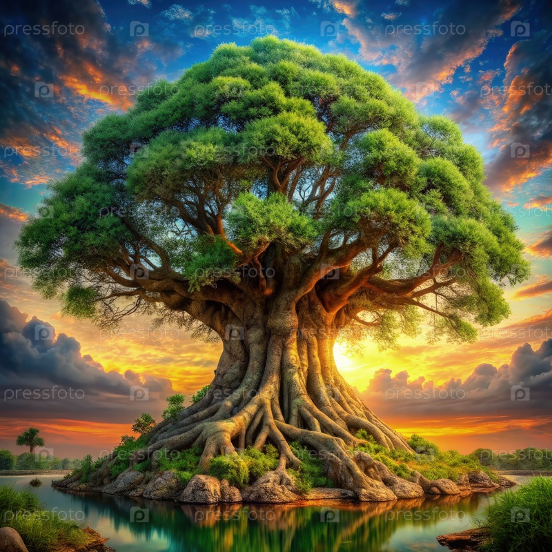 Древнее дерево с обширными корнями и закатом солнца в спокойном ландшафте