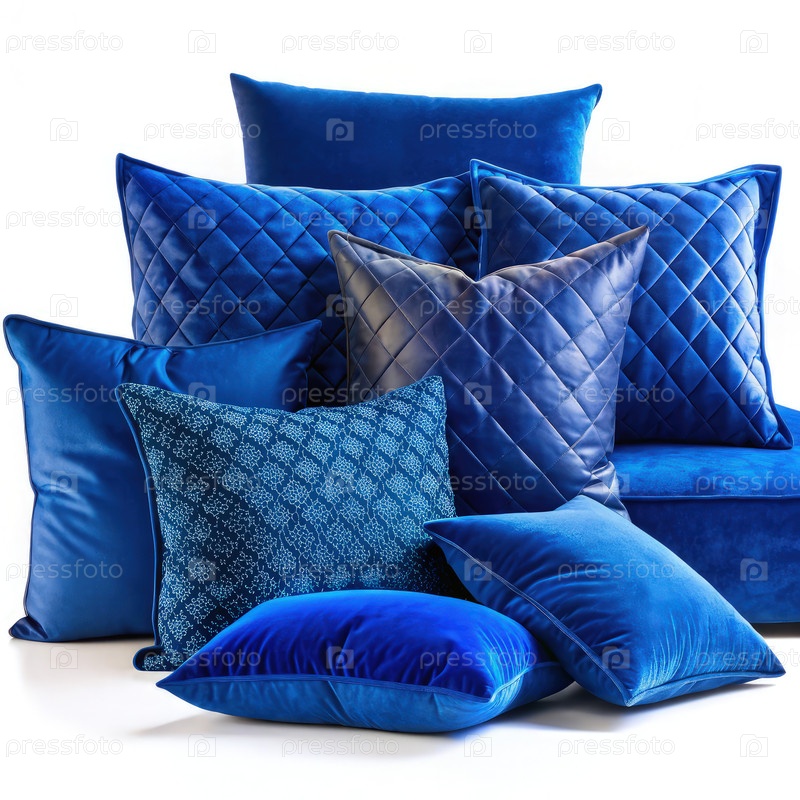 Коллекция роскошных королевских голубых бархатных подушек, художественно расположенных на ярко-белом фоне с акцентом на текстуру и контраст цвета