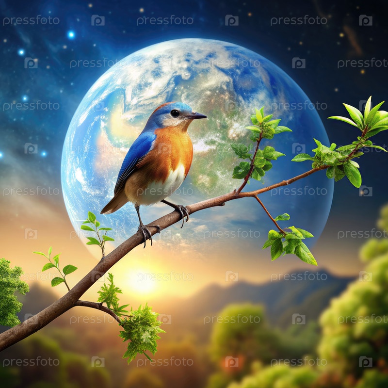 Красочная птица, сидящая на ветке и наблюдающая за планетой Земля во время восхода солнца