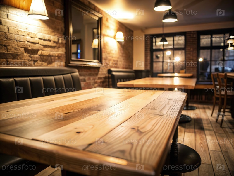 Пустой деревянный стол в уютном пространстве, освещенном мягкими огнями в вечерние часы