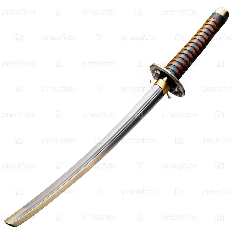 Строго спроектированная катана отображается на белом фоне с подробным отражением ручки и лезвия