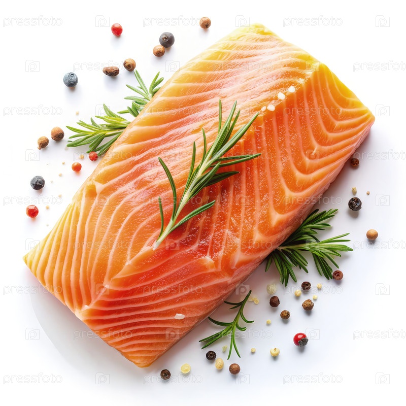 Вид сверху на свежее сырое филе лосося, украшенное травами и специями на чистом белом фоне, идеально подходит для кулинарных презентаций или рецептов