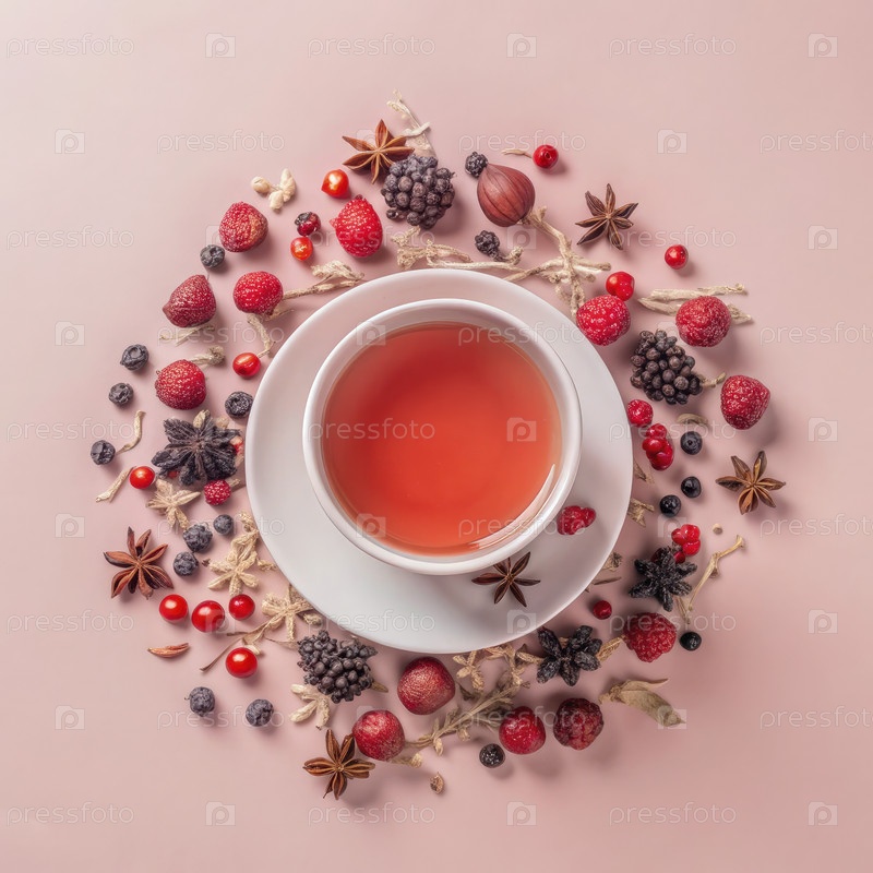 Презентация травяного чая и ягод, расположенных на пастельном фоне