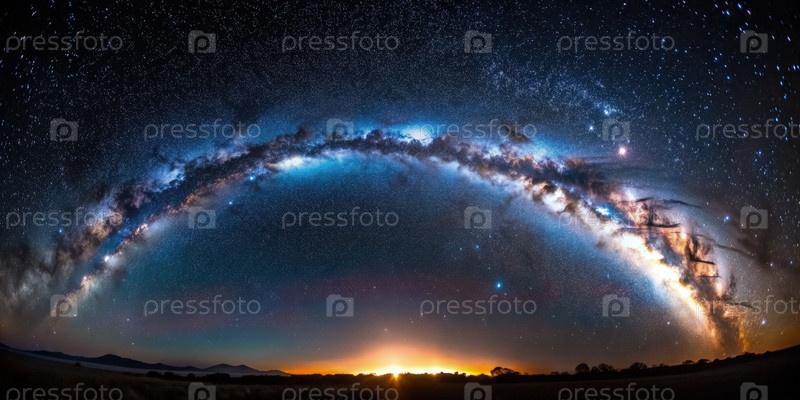 Звездное ночное небо демонстрирует потрясающую белую и синюю дугу во время сумерек