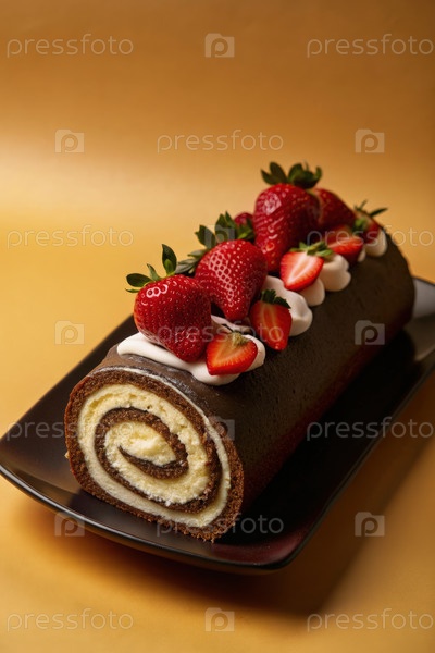 Вкусный швейцарский ролик, украшенный свежими клубниками и сливкой, подается на черной тарелке