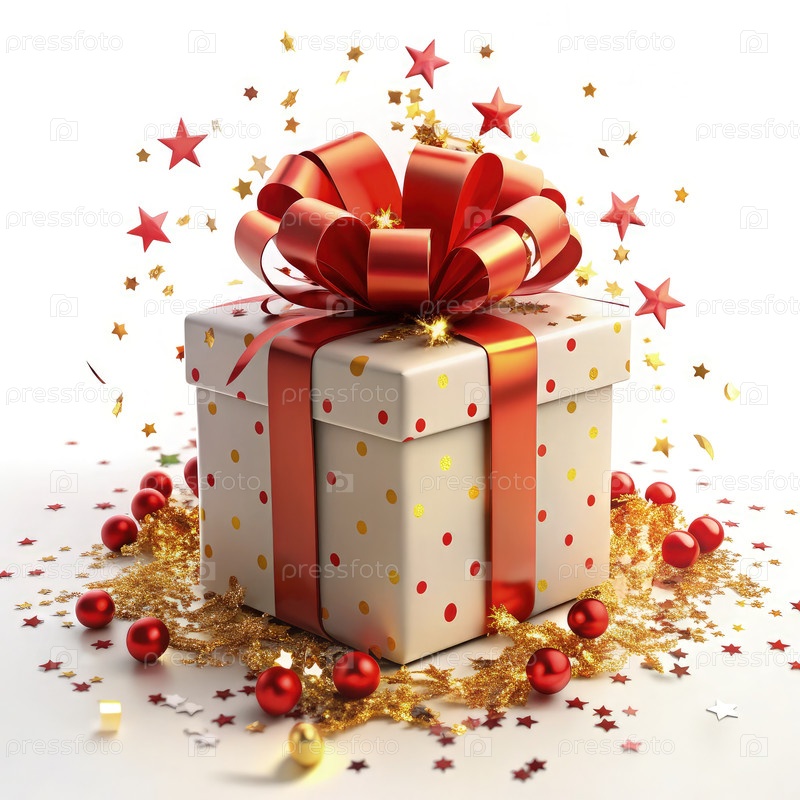 Красиво упакованный рождественский подарок, полный конфетти и сюрпризов, в окружении праздничных украшений и сверкающих орнаментов в радостной обстановке праздника