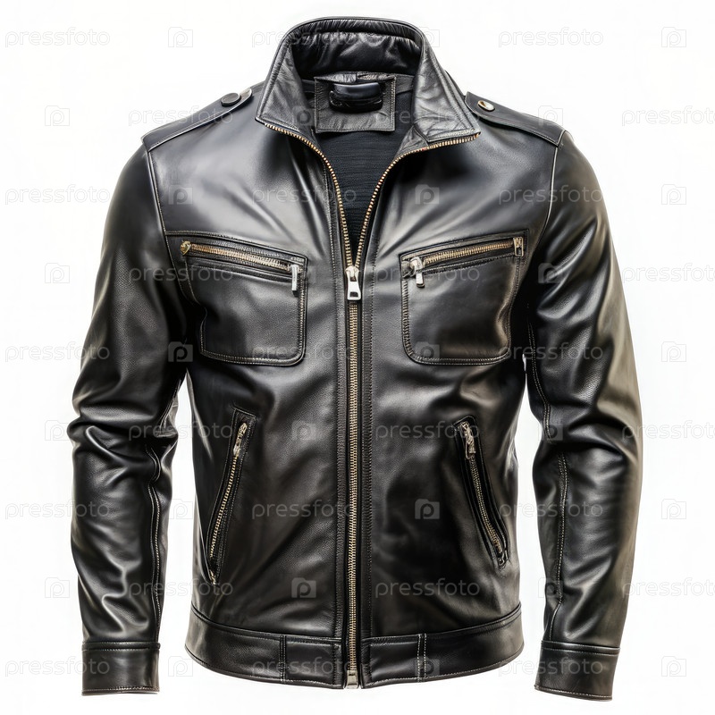 Стильная черная кожаная куртка отображается на стенде с деталями и карманами
