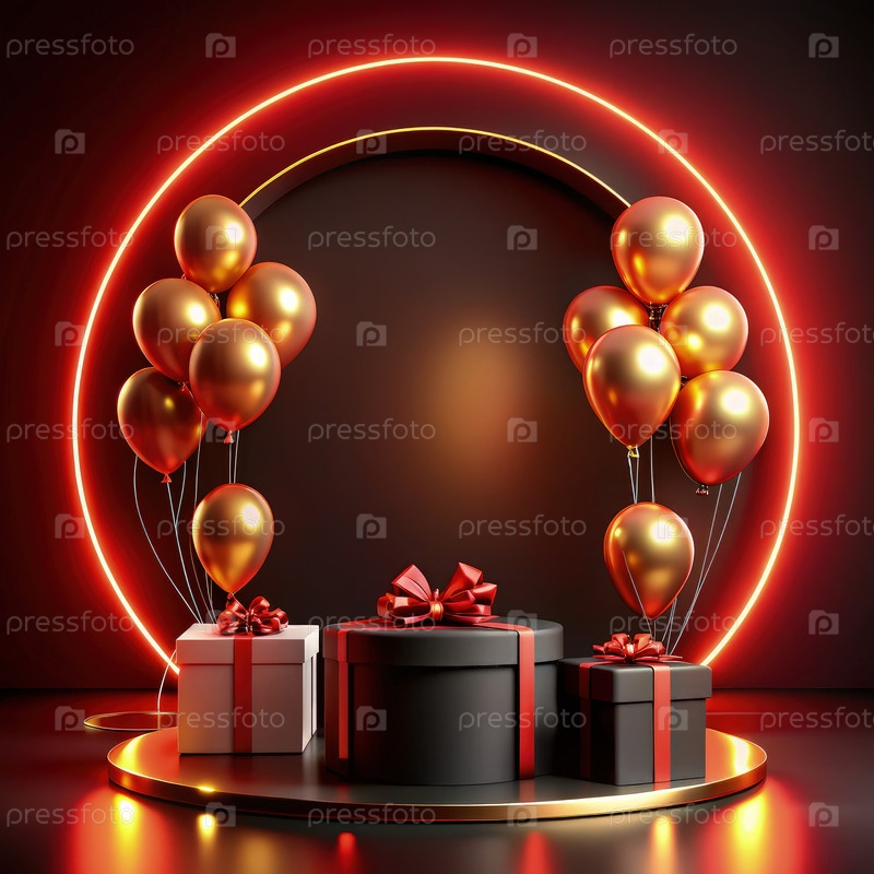 Праздничная черная пятница показывает пустую трибуну, окруженную золотыми шариками и элегантно упакованными коробками для подарков под драматическим освещением