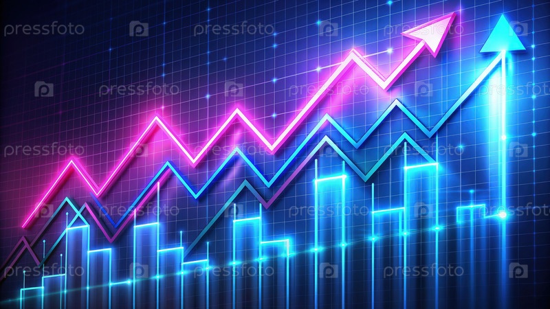 Динамический неоновый фон с стрелками вверх, иллюстрирующими тенденции роста аналитики ночью