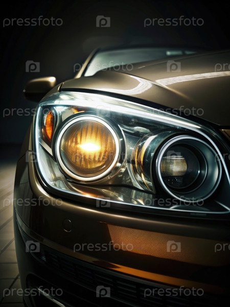 Близкий взгляд на фары автомобиля, демонстрирующие освещение в слабо освещенной среде, подчеркивая особенности дизайна и отражения