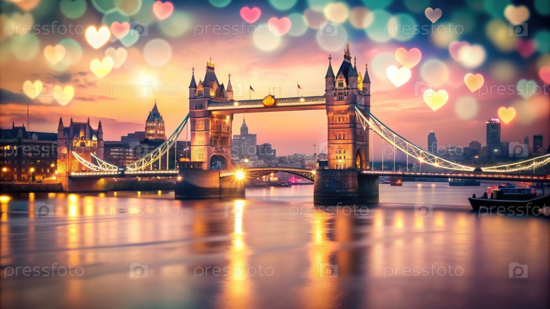 Романтический вечер над башенным мостом с боке в форме сердца и городскими огнями в Лондоне