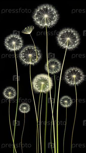 Деликатная плоская тонкая линия, изображающая различные одуванчики на черном фоне