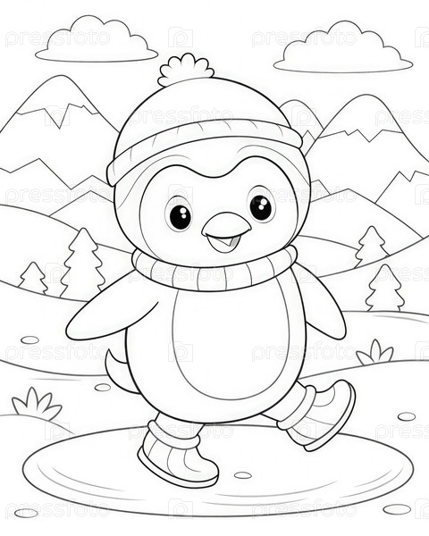 Красивая красотка с пингвином для детей, на которой изображен радостный маленький пингвин в зимнем костюме, ходящий по льду и окруженный заснеженными горами и соснами