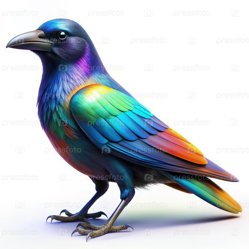 Живая многоцветная ворона уверенно стоит на белом фоне, демонстрируя свое потрясающее оперение и сложные узоры перьев