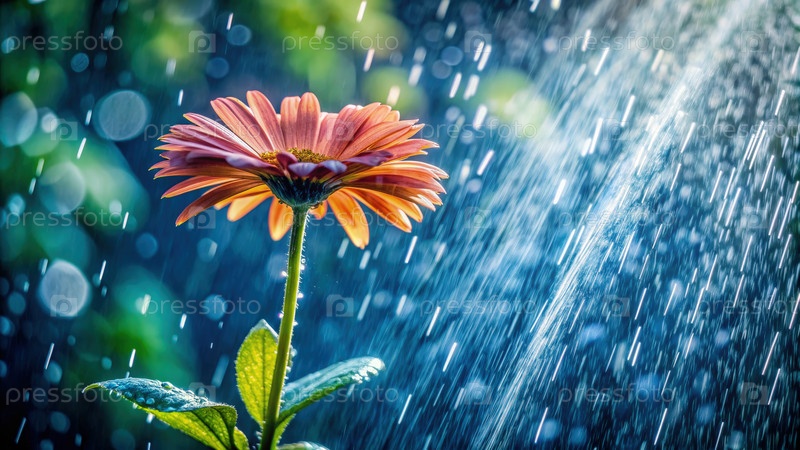 Капли дождя, падающие на яркий цветок во время дождливого дня в пышном саду