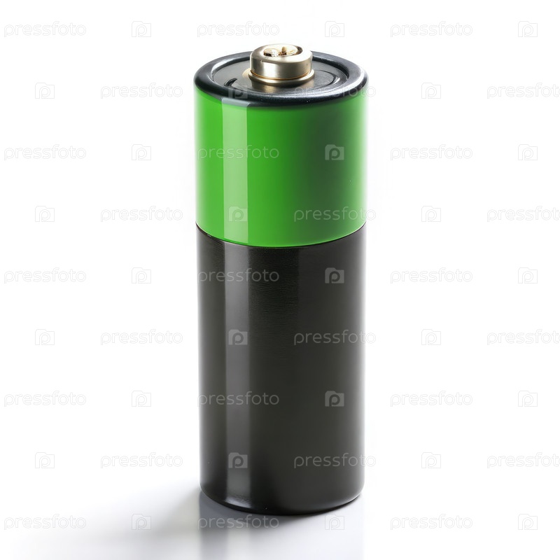 Стандартная батарея AA с черно-зеленым дизайном, расположенная в вертикальном положении на чистом белом фоне для четкого отображения ее деталей и структуры
