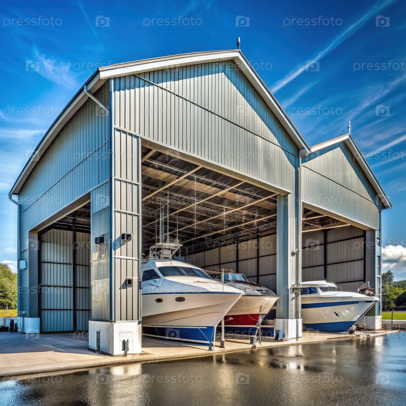Внешний вид яхт-ремонтного хангара, в котором многочисленные лодки находятся в ясный день