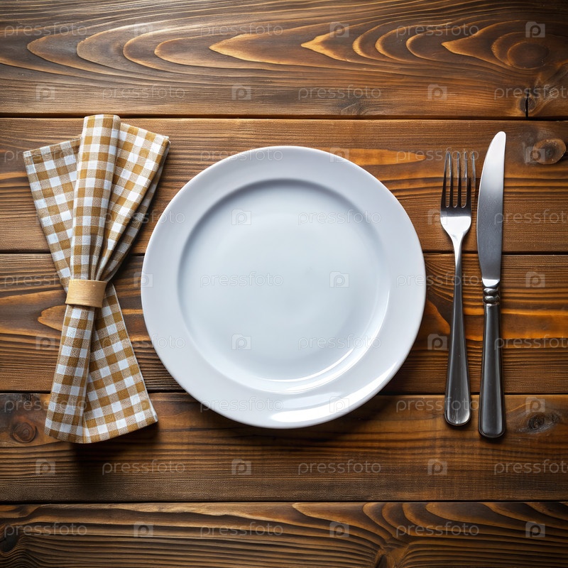 Пустая закусочная тарелка западного ресторана, установленная на деревянном столе с серебряными принадлежностями
