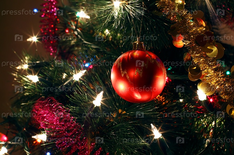 Блестящий красный орнамент висит на украшенной рождественской елке