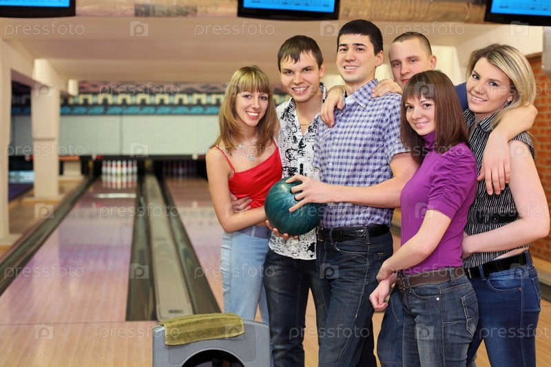 Один парень держит мяч для боулинга, а его друзья стоят рядом с ним
