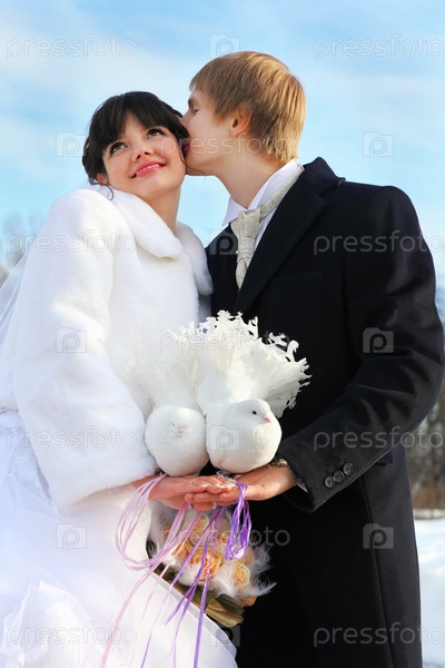 Красивая невеста и жених держат пару белых голубей на зимней природе;
