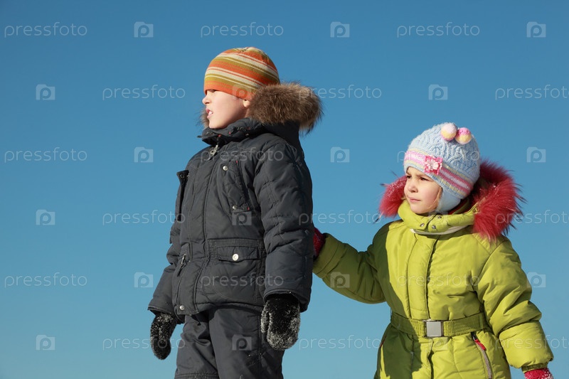 Маленькая девочка в зеленой куртке и мальчик, стоящий на снегу и оглядывающийся