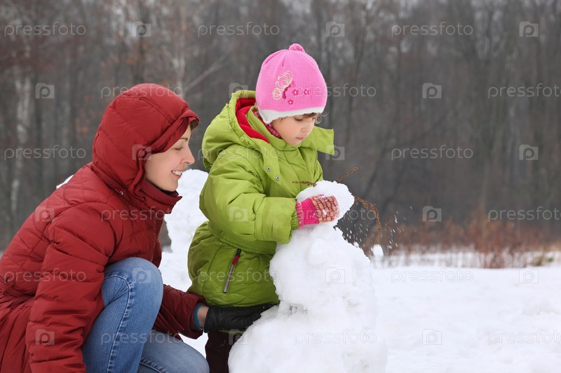 Мать и ребенок вместе строят снежного человека