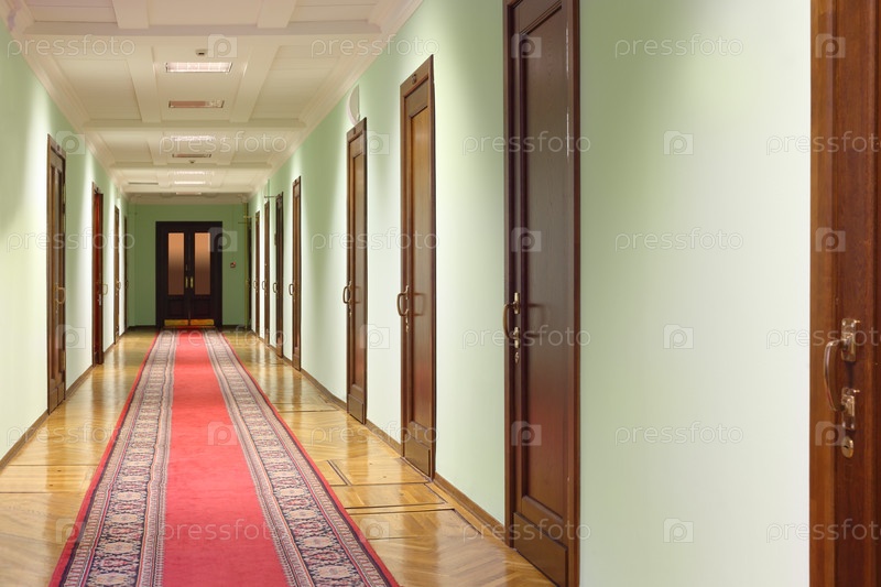 Длинный коридор с бурыми деревянными дверями, дверь в конце коридора, красная