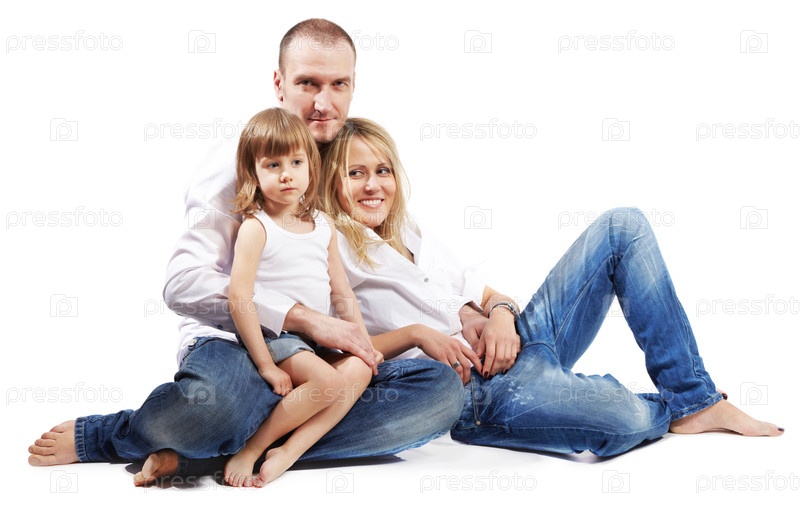 Отец, мать и маленькая дочь в белых рубашках и джинсах сидят на
