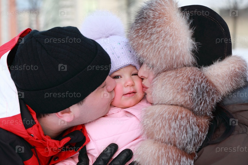 Мать и отец целуют свою маленькую дочь, зима, многомагазин