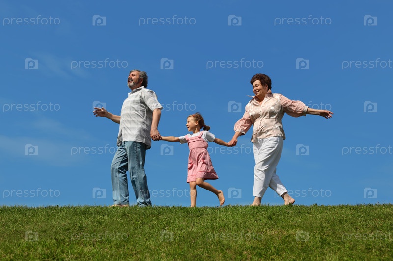 Маленькая девочка и ее бабушка с дедушкой бегут по лужайке, держась за руки