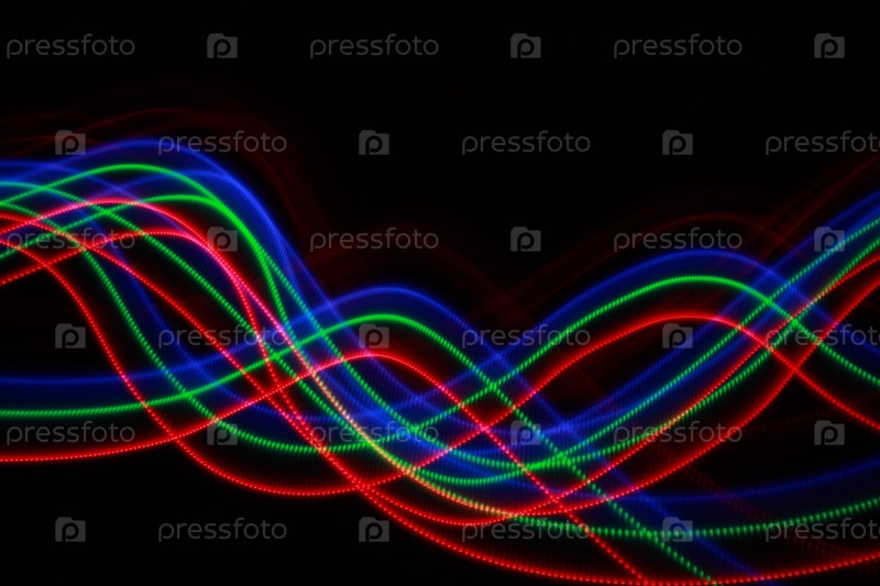 Абстрактные красочные линии на черном фоне, синий, зеленый и красный