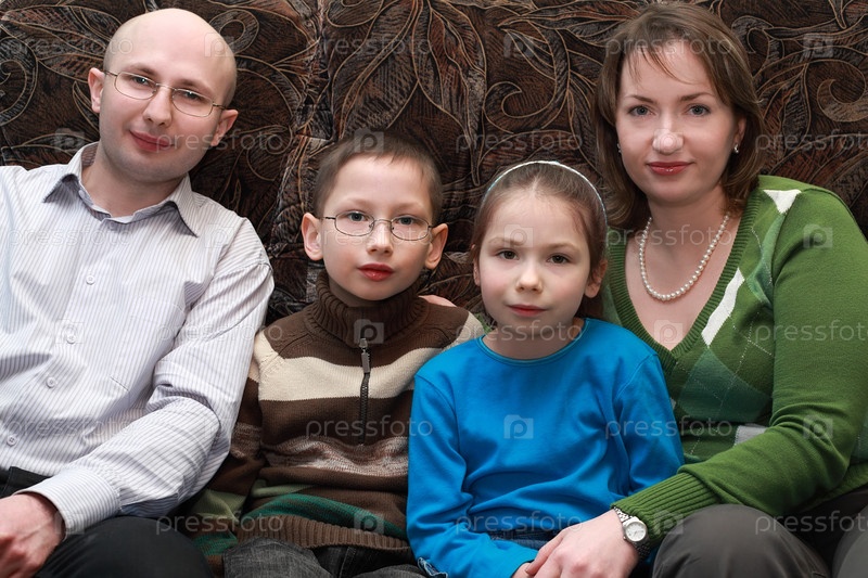 Отец, мать, сын и дочь сидят на диване и улыбаются, счастливы