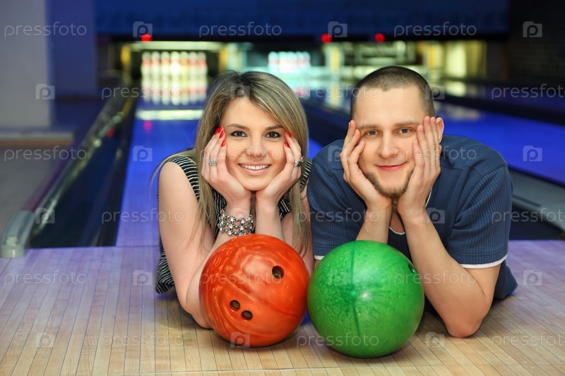 Молодая пара улыбается перед камерой с мячами для боулинга